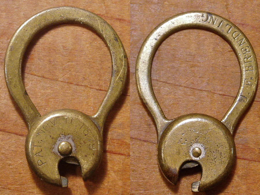 プレート部分に【PAT.NOV.11.1879】と刻印が入っており、リング部には【J.F.BRENDLING】と古いフォントで、前の持ち主の名前?の刻印が入ります。リング部に文字が入る物は、元々数が少ない同物の中でも珍しいです。