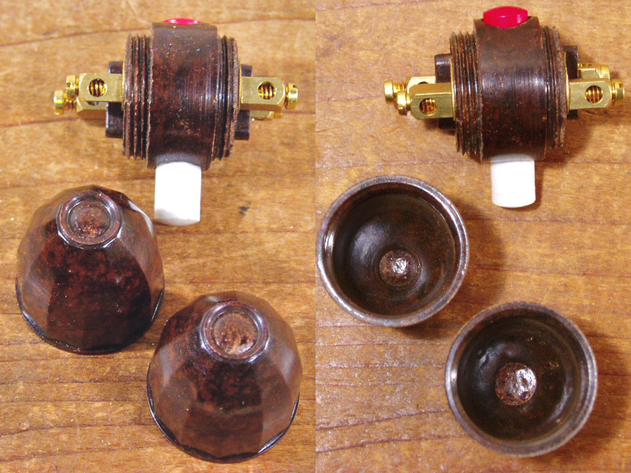 珍しいデッドストックですので、両端にある"配線の穴"が薄皮一枚で塞がれております。ペンダントスイッチとして使用する場合は片方だけ、ランプの中間スイッチとして使用する場合は両端を爪楊枝などで突いて開けて下さい。