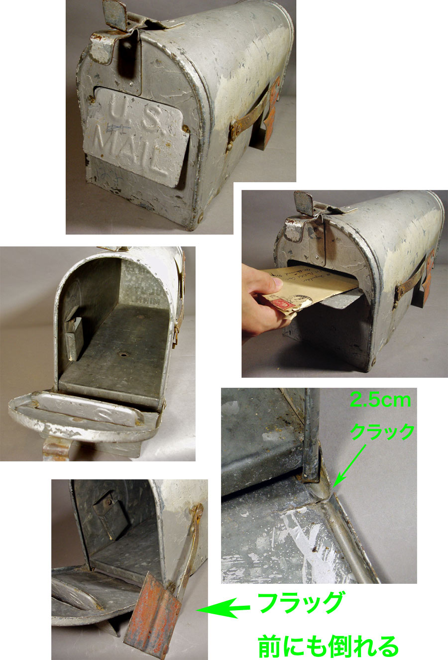 ふたは、取手の部分で南京錠でロックできるように作られており(歪んで少しズレてますが)、手紙は【U.S. MAIL】の可動式のフラップを開いて入れるようになっておりますので、セキュリティー面も万全です。内部にはコインポケットも付いております。