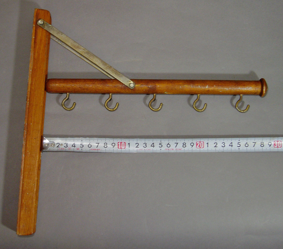 1920年代頃の木&鉄製の壁付け(2点留め)折り畳みハンガーラックです。クルミ材でしょうか、良い風合いの木質です。