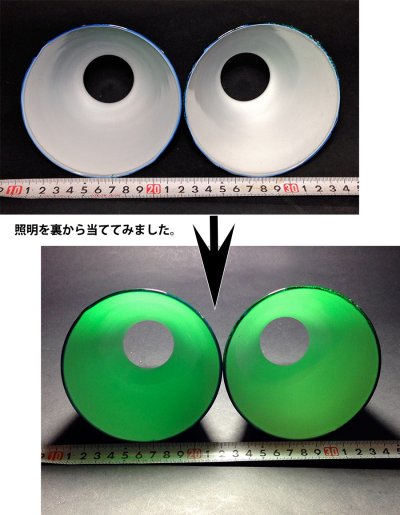 以前販売した >> コチラのデスクランプ に付属していたようなシェードで、アメリカの製品としては1900年代初頭から真鍮製の >> バンカーランプ などにも多用されていたシェードと同じ製法のガラスシェードです。