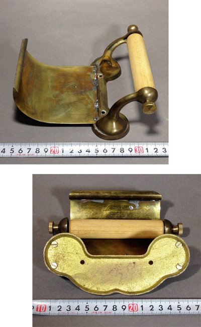 珍しいフラップ付きで、フラップ先端のエッジ部の裏面にはブラスバーがハンダ留めされておりますので、トイレットペーパーの空回りによる垂れ下がりを防止できます。フラップ根元の各所もハンダ留めされており、古い製法です。