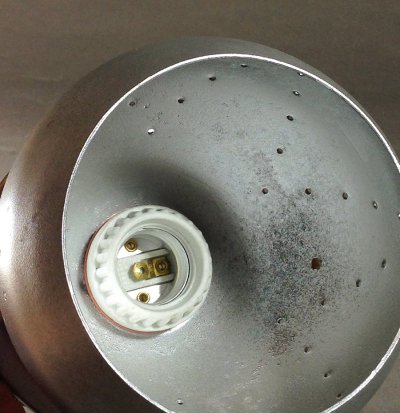 シェード内部に、経年程度の真鍮の腐食による塗装の荒れ等はございますが、内部は光の反射効果の為シルバーを残しておくべきかと思いますが、外側はお好みに応じて再塗装など行っても良さそうです。