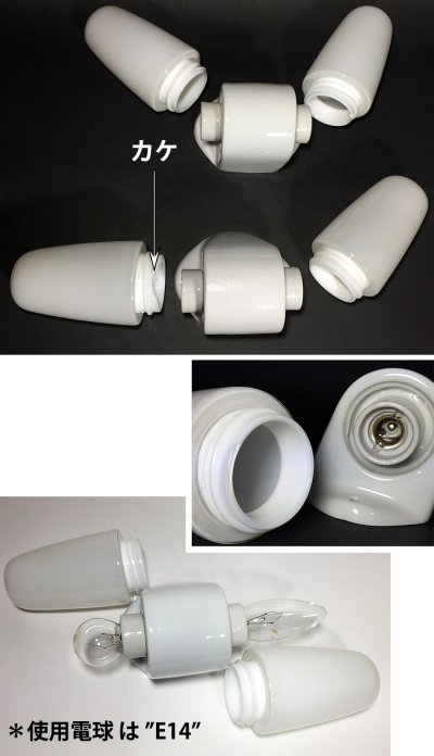 電球は付属致しませんが、日本でも普通に販売されているE14サイズです。点灯画像では、画像で示しましたようにシャンデリア球と丸型をそれぞれに使用しましたが、スペース的にはどちらでも問題なさそうです。