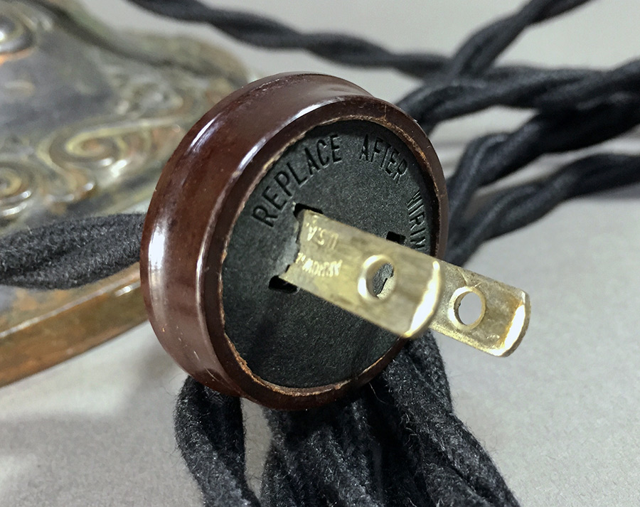 また、コンセントプラグはオリジナルの焦げ茶のベイクライト製のままで、当時らしく、そして本体とも同じ "植物柄" です。(*差し込み部の "REPLACE..." 刻印の絶縁カバーはリプロです。)