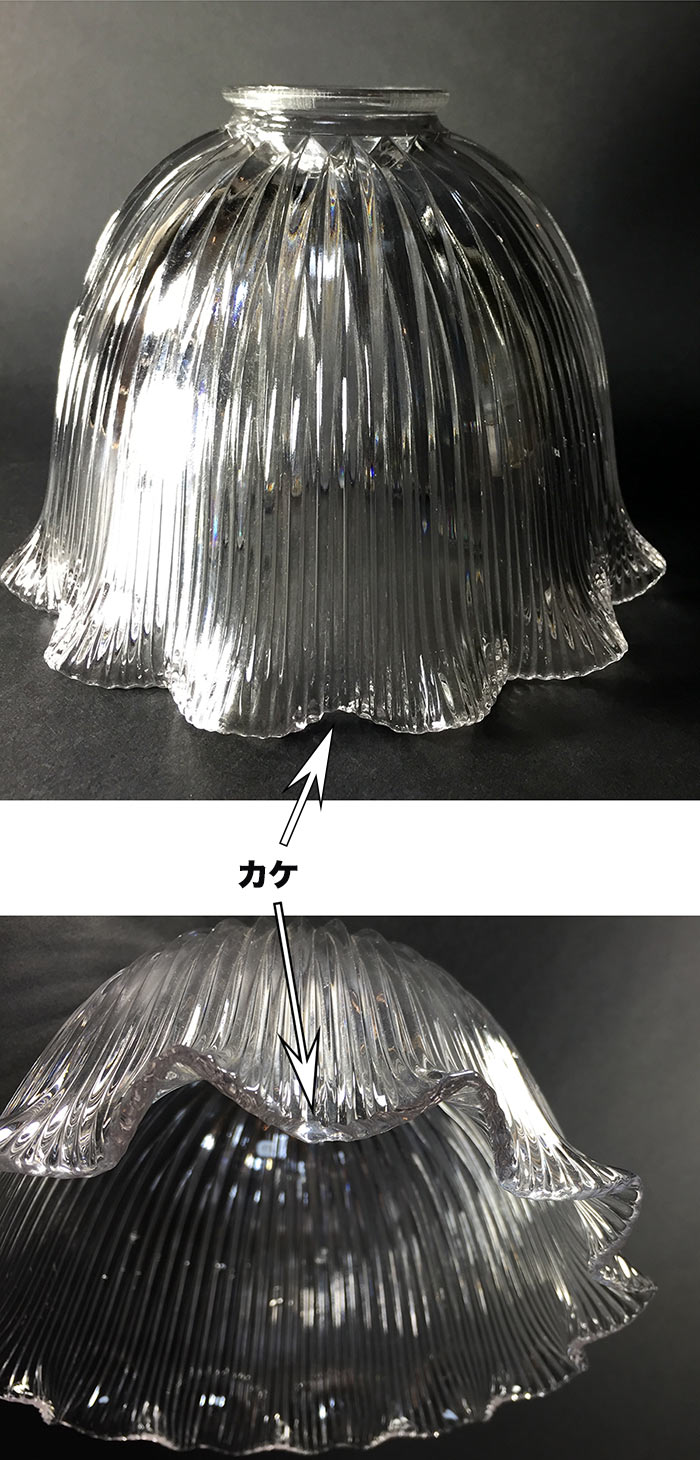 経年程度の汚れやリブの部分に細かなチップ。そして、画像矢印で示しました箇所に面積が広いわりに "浅い" カケがございますが、画像でも認識しづらい程度かと思いますので、使用中に気付く方などはいないと思います。コンディションとしては良好です。