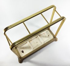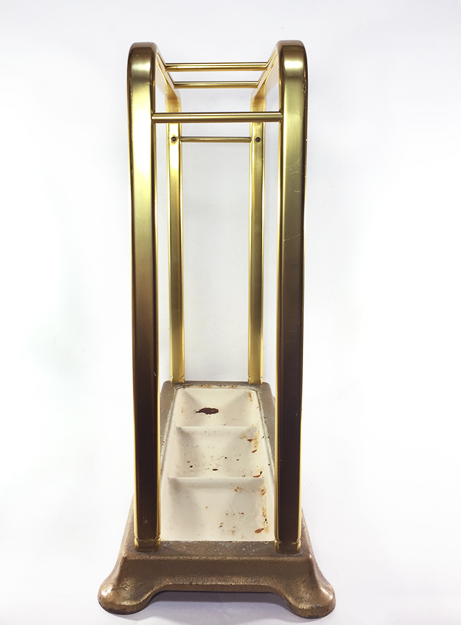 今回の物もアールデコ期らしい細身でスタイリッシュなデザインなのですが、アイアン製の足がかすかに "猫足" 風のうえ、水溜めの部分の塗料剥げやサビ、そして珍しいゴールド仕上げということも相まって、モダンでありながらもシャビーな雰囲気も持ち合わせてた不思議な雰囲気の商品となっております。