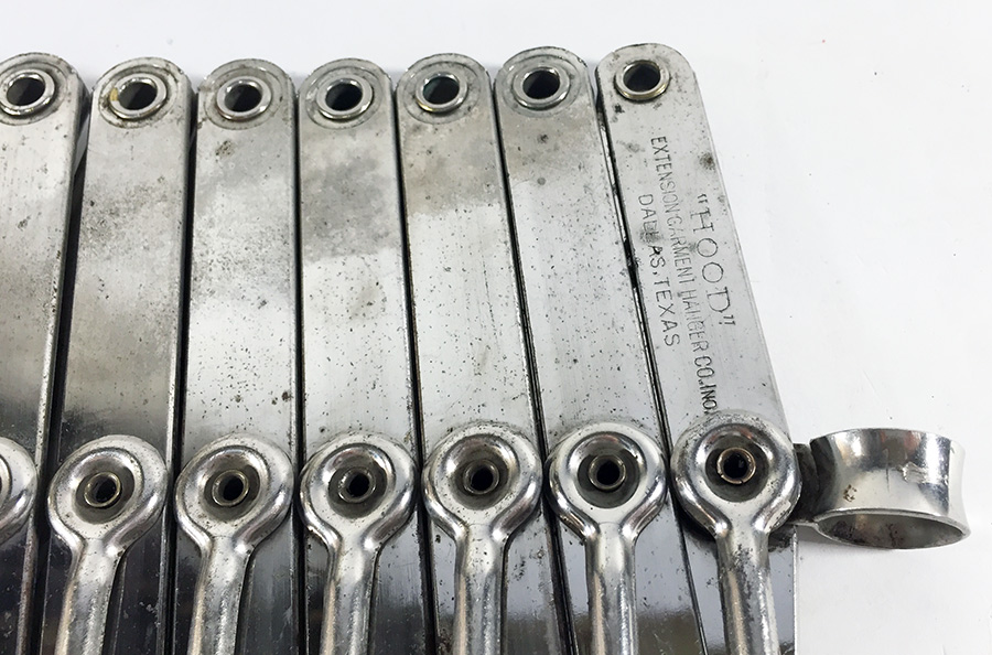 アコーディオン・アームの各中央部にスウィングタイプのループパーツが8個ぶら下がっておりますが、当時の仕様書ではそれらの間にあるアーム下部のループにもハンガーを掛けて上下ジグザグに掛ける様になっておりますので、計16着掛けられます。また、このアームは、アーム間の形が◇になるまで伸び切ります。(最後の画像参照)