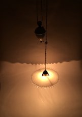 1920〜30年代のフランス製ペンダントランプです。珍しく陶器製の滑車や、高さ調整用のウェイトなど全パーツ揃っている完品です。
