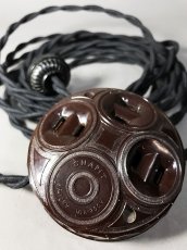 1930年代頃のアメリカ製 "SNAPIT” - 延長コード + 3口ベイクライト製コンセントタップ(焦げ茶)です。コンディションは、使用感やかすかなペンキの飛散はございますが、3口全て "スッ" とほどよくタイトにコンセントを差し込め、大変良好です。
