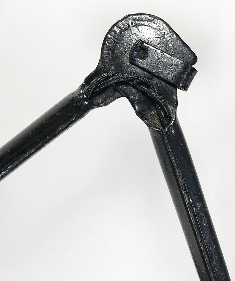 今回の物は、一見するとオリジナルの塗装のようですが、所々に塗装の凸凹感が存在しながらも地金のスチールが露出しているところがほとんどないため、薄めではございますが全体的に再塗装(オーバースプレー)が施されているのかと思います。ただ、この塗装自体もそれ相応に古い黒塗装のようで、現状はアンティーク感満点なツヤとなっております。