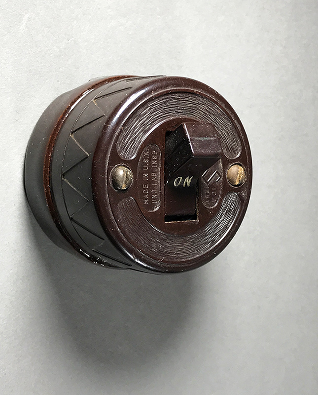 少し珍しい形状のベークライト製(焦げ茶)カバーを持つスイッチです。(壁付け2点留め)