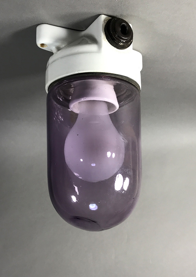 珍しいラベンダーカラーのガラス製(大小の気泡も入っております)シェードがついており、ドイツ製らしいスッキリとシンプルなパーツ・デザインです。