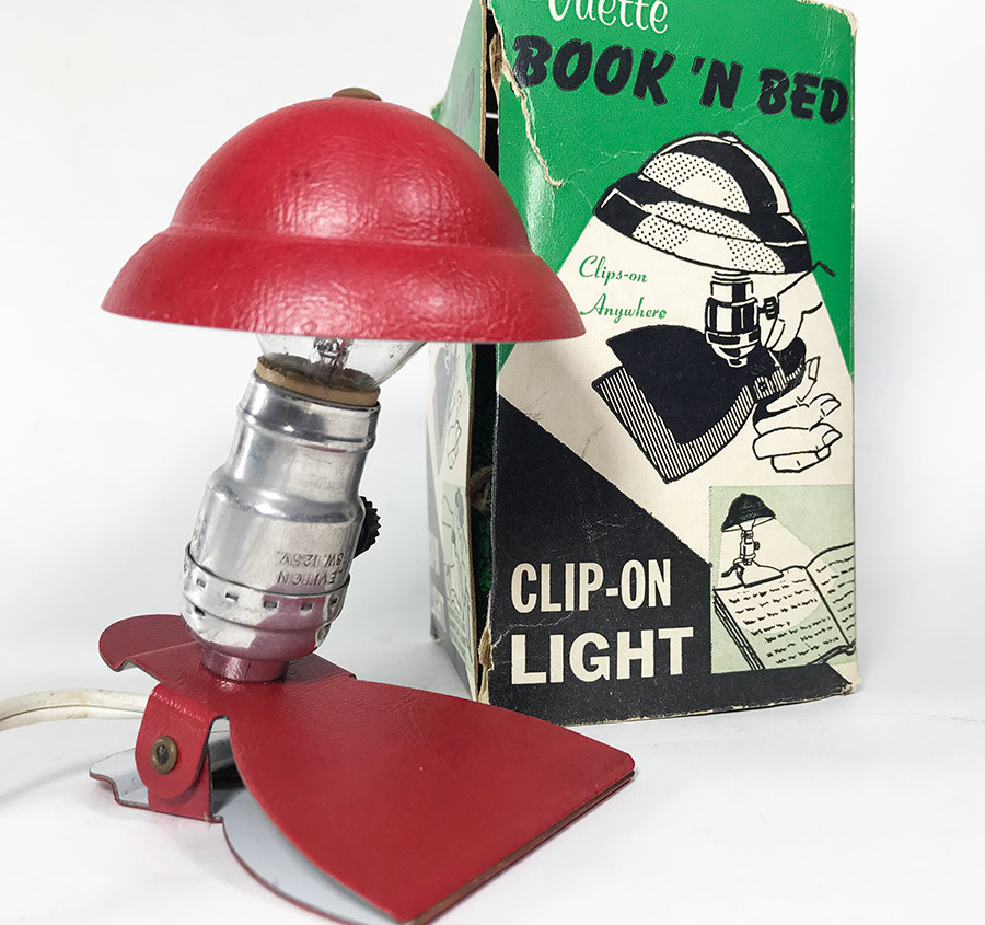 1940〜50年代頃のクリップ式ミニランプです(箱付きデッドストック)。シンプルですが流線型のデザインでかわいいです。今回はお初となるデッドストックで見つかり、カラーリングもお初となるディープレッドです。この赤は鮮やかな赤ではなく、深い赤で、塗装というよりはラバーコーティングのような仕上げが施されておりますので、画像の通り "シワ感" があり、チープさはございません。