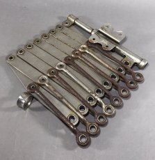 アコーディオン・アームの各中央部にスウィングタイプのループパーツが8個ぶら下がっておりますが、当時の仕様書ではそれらの間にあるアーム下部のループにもハンガーを掛けて上下ジグザグに掛ける様になっておりますので、計16着掛けられます。また、このアームは、アーム間の形が◇になるまで伸び切ります。(最後の画像参照)