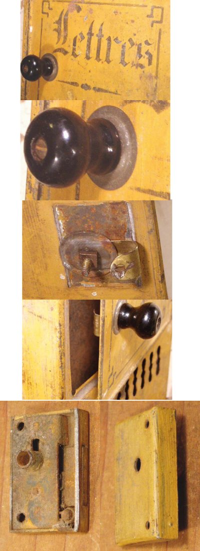 扉部分に本来は鍵が付いておりました(画像有り)。こちらもハンダ付けで留まっていた様ですが、鍵ごと取れてしまっています。スケルトンキーもございません。[こちらは付属しますので、ピッタリ合うスケルトンキーが見つかった場合に修理して使用して下さい]