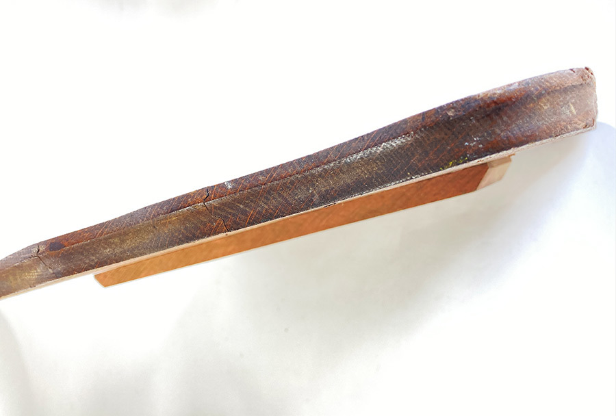 素材はおそらくオーク(楢 - ナラ)となりまして、非常に珍しい “蛇紋カット” のエッジを持つ天板です。こういった職人技を感じる天板はナカナカ出てきません。