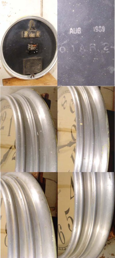 フェイスはガラスで、ボディーは当時は珍しい無垢のアルミ製、ボディーは経年のアルミ独特のくすみ、全設置場所の壁のペイント飛散等ございますが、アンティーク特有の使われてきた感が出ていて雰囲気は良いと思います。