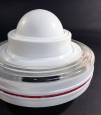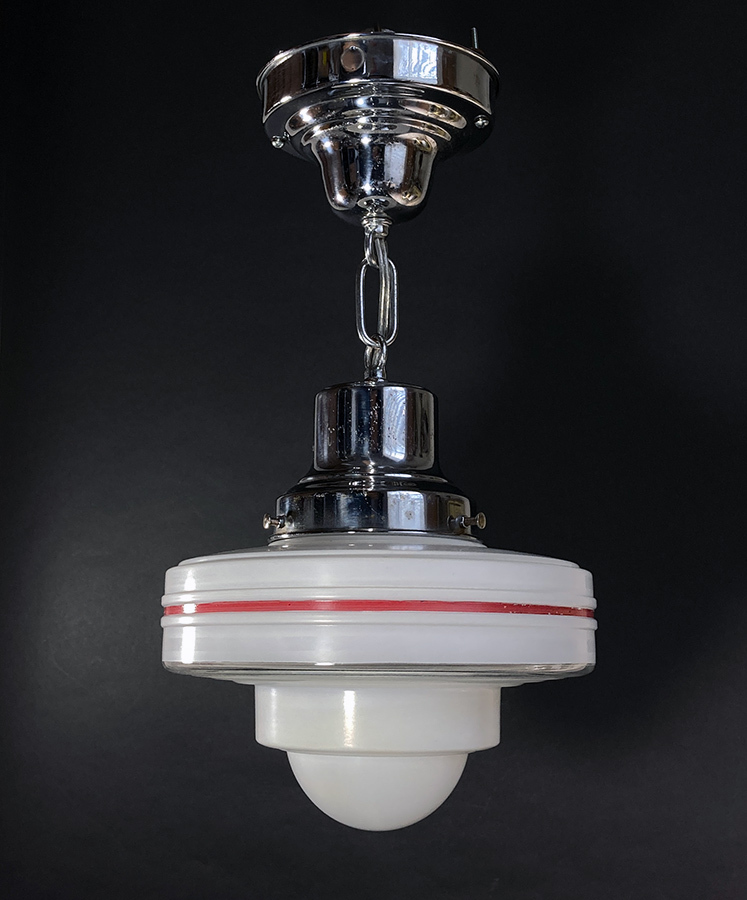 この "2トーンシェード" の製法は、もともとはクリアガラスを白塗装されております。ただ、その塗装が単なる塗装などではなく、ガラス質の顔料で塗られた後に再度焼かれ(?)、焼成されて仕上げられている頑丈なものですので、爪やヘラで擦ったり、経年で取れてしまうようなものではございません。赤いラインも入れられて当時のアメリカンダイナーにぶら下がってそうなポップなデザインです。