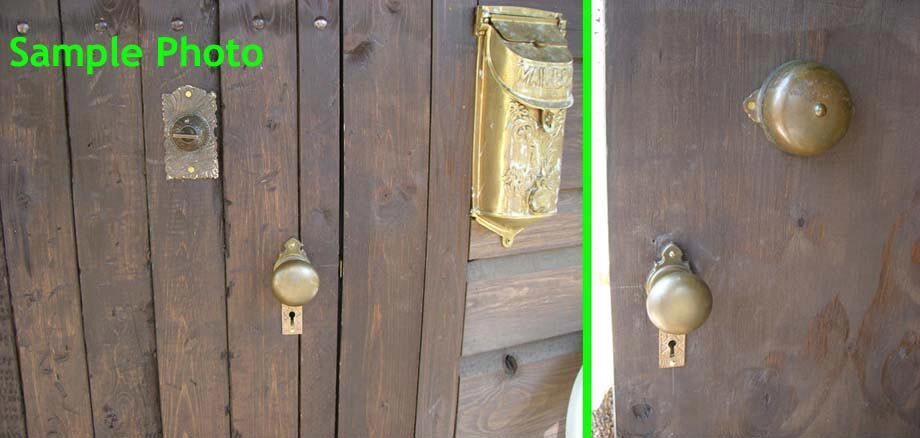 玄関ドア、または玄関脇に設置するもので、ノブが付いたレバーを屋外側に設置し、ベルを屋内側に設置します。"Sample Photo" は取り付け例としての掲載です。
