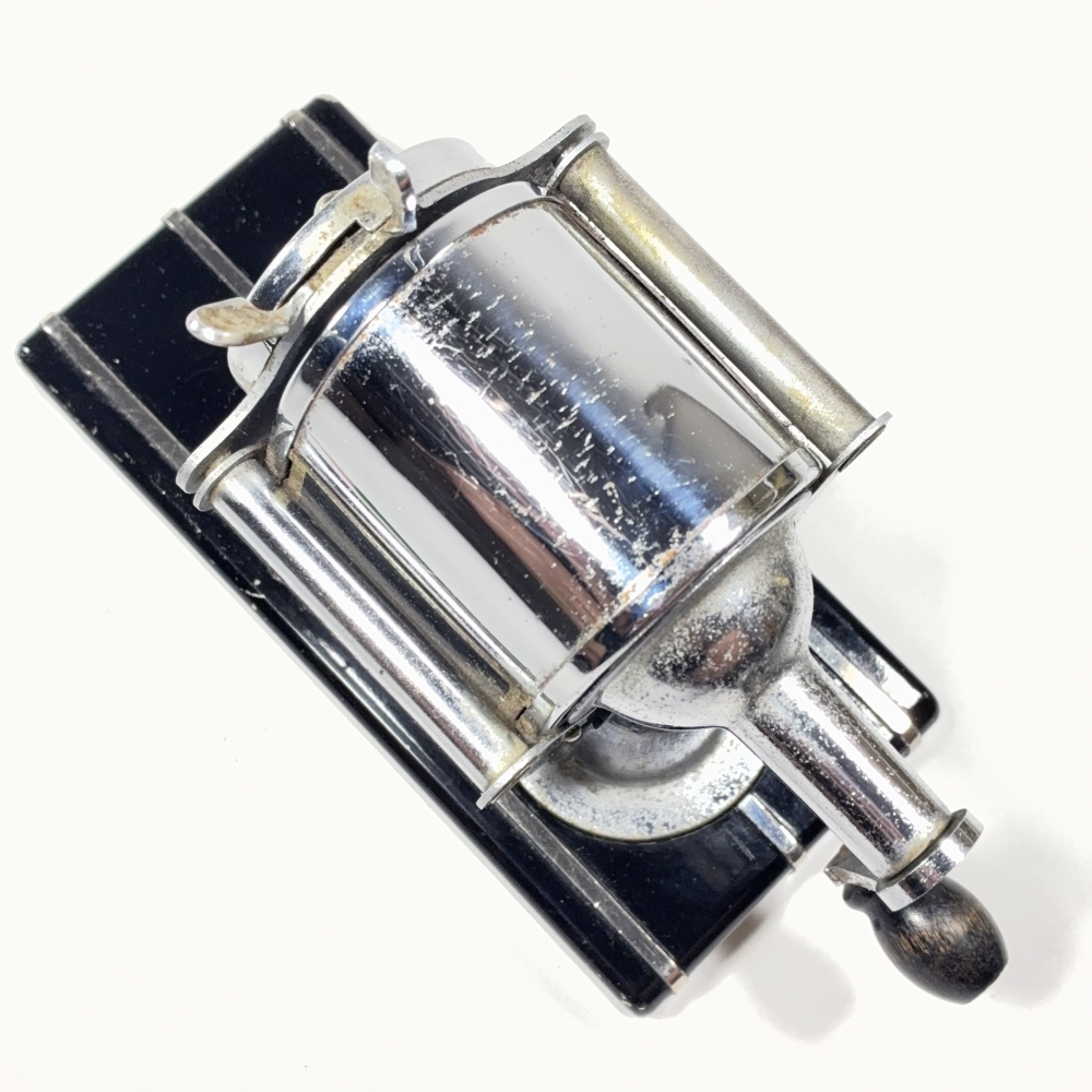 本体が乗っているベースは、アルミか何かの合金のキャスト(鋳造)製で、本体と同じくクロムメッキ後に黒塗装仕上げ。こちらも使用感がありますが、この製造方法だから造り出せるクロムラインのデザインがかっこいいですね。
