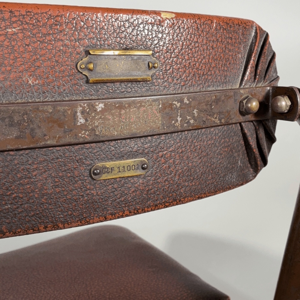 レザーはオリジナルのようにしか見えないのですが、おそらくはオリジナルではなく、1940年代頃のフェイクレザーに張り替えられているようです。理由はシート裏に釘やサイズが異なるレザー跡があるからですが、もしかすると何らかの理由で一度剥がして、カットし直して(?)貼り直しただけかもしれません。