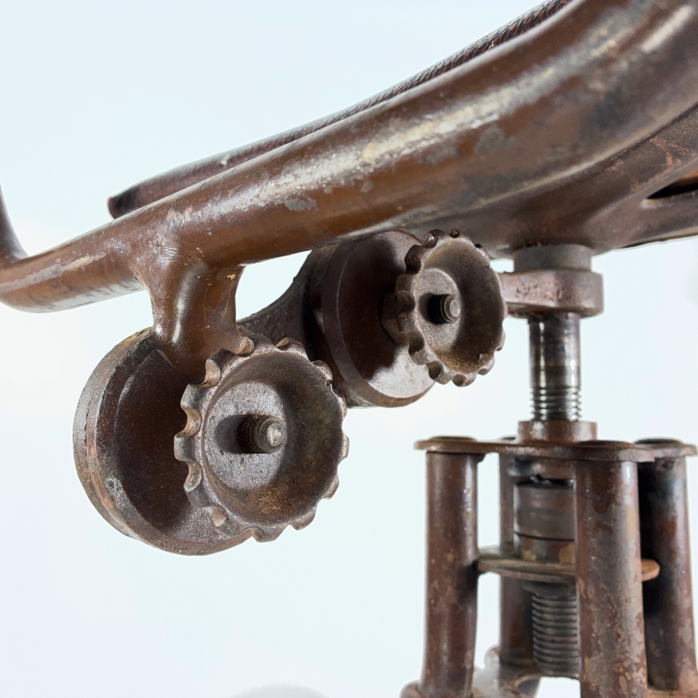 この椅子の最大の特徴は、なんといってもゴッツリと大きなキャストアイアン製アジャスト・ノブによるメカニカルなルックスと、バックレスト(背もたれ)の調整度の高さです。フォロー出来ない箇所はございません。
