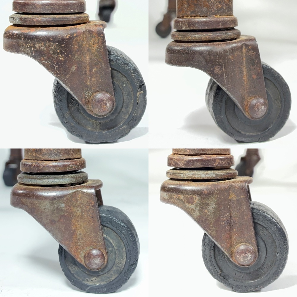 またキャスターに関しまして、刻印などは無いですがおそらくオリジナルキャスターです。それぞれに経年程度の凸凹やダメージがございますので、“コロコロコロコロ” といった感じではなく、凸凹により、かすかに“コロコロコロっコロっ” とは動いてしまいますが、実用に際しては、使用感、耐久性も含めて特に問題ないと思います。