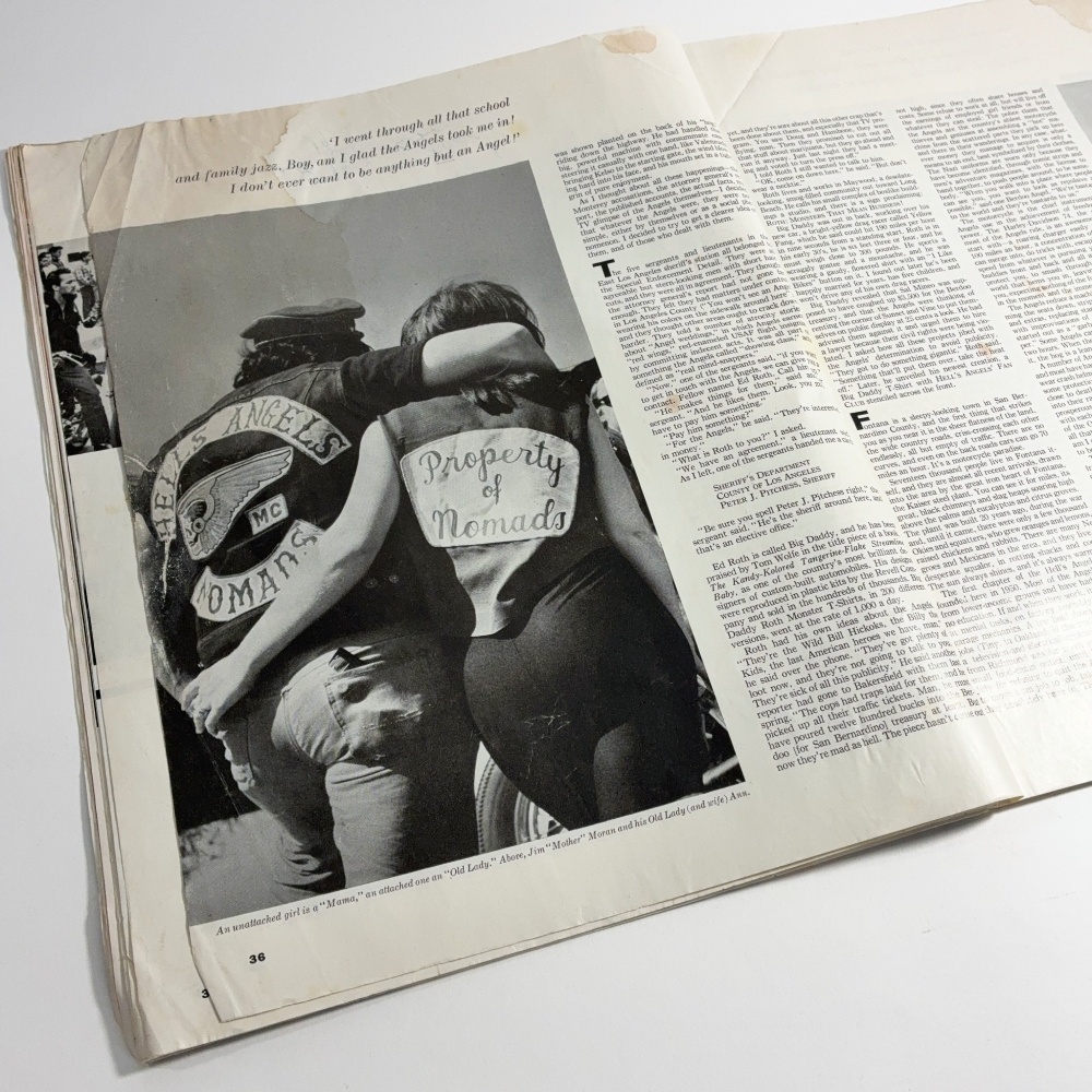 長期保管による古本となりますので、ヘルズエンジェルスのページにシミがあったりしますが、雰囲気的にはOKだと思います。他にも7枚目の画像のように、一番真ん中のページのホチキス留めの箇所にテープによる修繕などもりますが、普通に読む分には何も問題ございません。