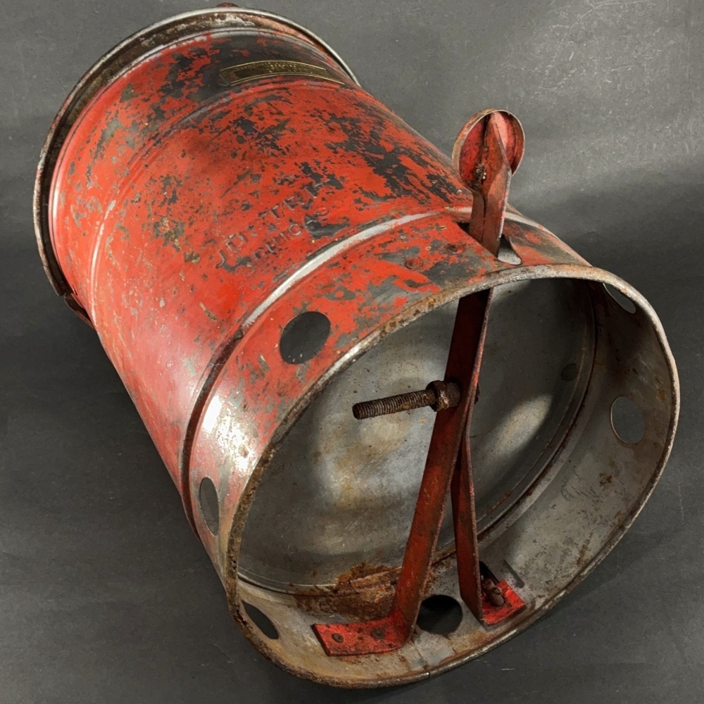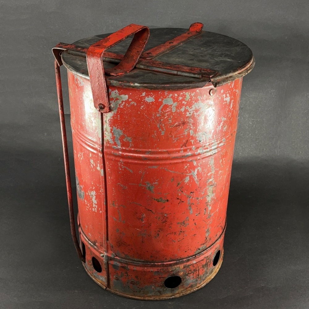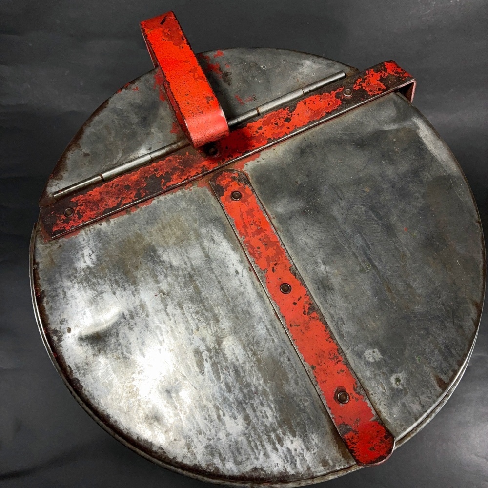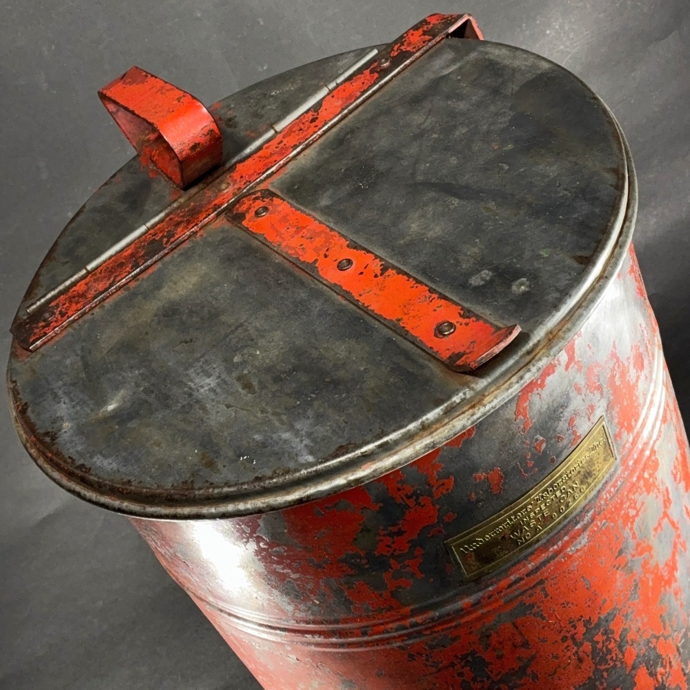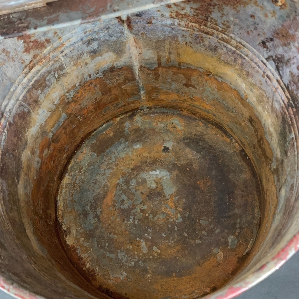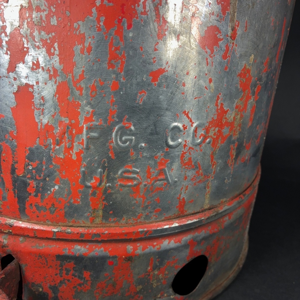 今回の物は "寸胴" 部分のサイズはおおよそ31cm×33cmですのでアメリカサイズの6ガロン【6 Gal.(22.71L)】くらいですので、個人の方のデスク脇などにちょうど良い感じの大きさですが、この色とヤレた雰囲気を考えるとガレージや店舗、アトリエなどにもぴったりですね。