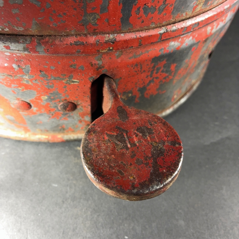 色は、深く、ツヤもなく落ち着いた朱色に近いオリジナルのレッドのままです。蓋のみ剥離されているようですが、デザインを考えてか、リベット留めのステー&ハンドルのみ塗装が残っております。