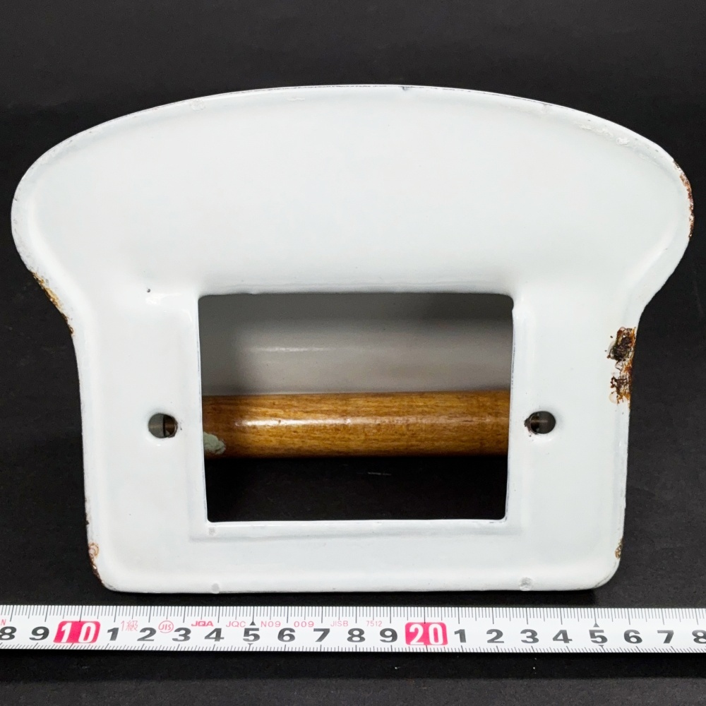 全て鋳物ホーロー製(キャストアイアン製焼き付け塗装)で、古〜いバスタブやキッチン用品などと同じ製法です。その為、2.1kgとトイレットペーパーホルダーとしては非常に重いので、シッカリと壁に固定する必要がございます。(2点留め)