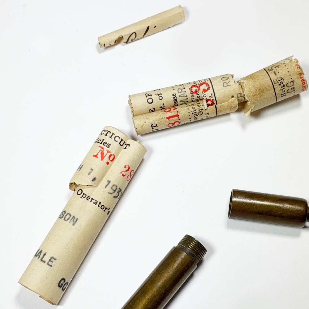 中には1931年のコネチカット州内での運転免許証が入っております。モータリゼーションや世界恐慌真っ只中の時代の書類で、そのような時代に自動車を所有している事自体もすごいのですが、驚きなのはその時点で71歳の男性のものですので、生まれは1860年、あのリンカーン大統領の時代から生きていた方の持ち物だったようです。