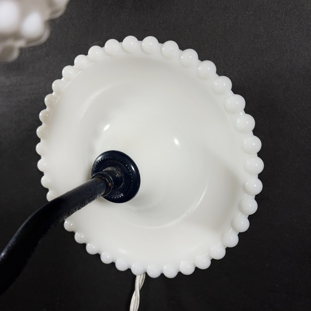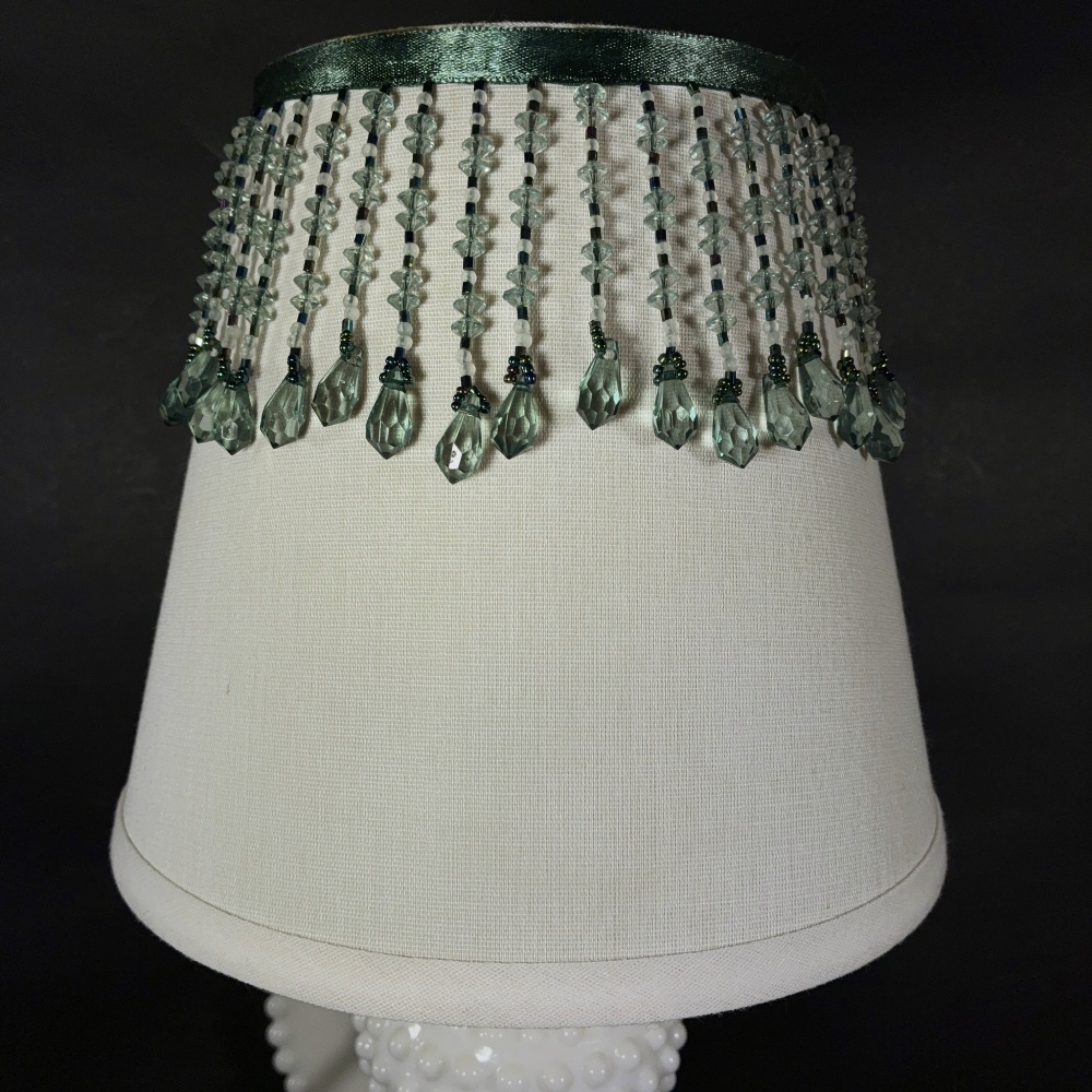 ミルクガラス製で、本格的なビーズの装飾をされたファブリックシェード( 直径:上部13cm、下部20.5cm)付きですので光が柔らかくなります。