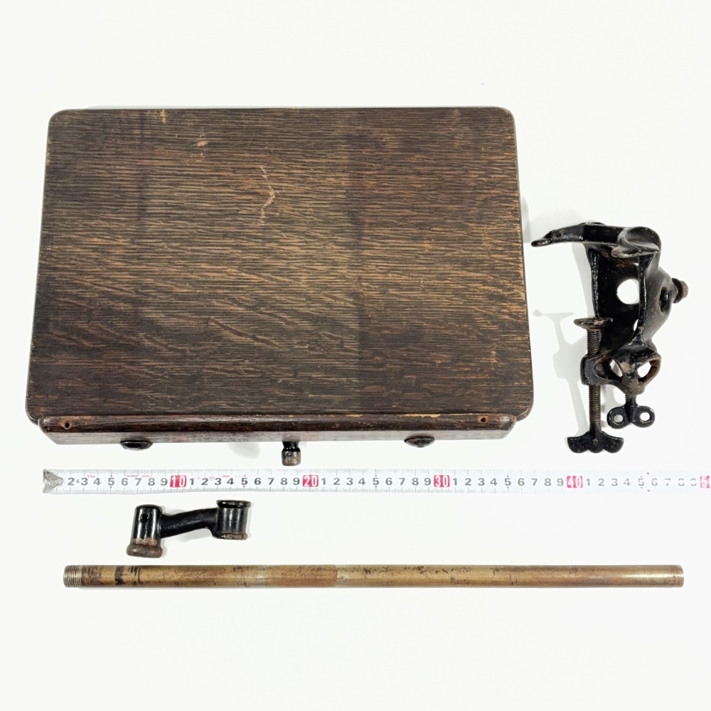 また、このクランプ部についている小さい方のウイング付きネジで、縦横のどちらもカバーできるはずなのですが、ねじ山がかすかにナメてしまっている理由で矢印の箇所の部分には噛みません。ですので、当時物のボルトを付属させました。画像のままのスタイルでご利用の際は、モンキーなどで軽く締めてください。