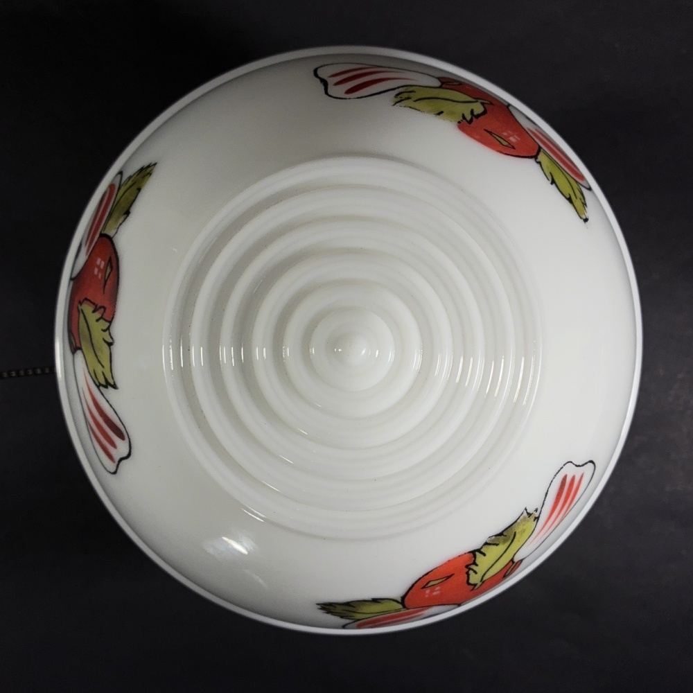 この "カントリーシェード" はこれはこのまま、なんとファクトリーメイドで、製法としてもガラス質の顔料で野菜を描かれた後に再度焼かれ(?)、焼成されて仕上げられている頑丈なもので、爪やヘラで擦ったり、経年で取れてしまうようなものではございません。(葉っぱの一部薄れている箇所などは元からこのように描かれているようです)