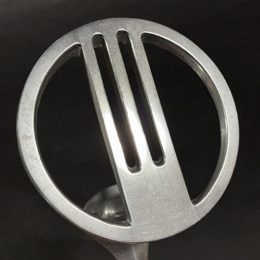 キャスト・アルミ製で、アルミのカシメ留め、丸みを帯びたスタイリッシュデザインです。下にミニフックがついているのも良いですね。