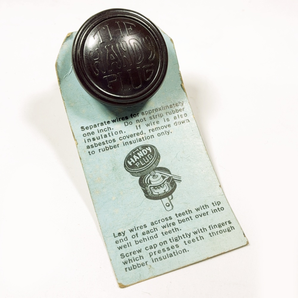 当時のスタンダードな丸いボタン型プラグですが、前面にはコミカルなフォントで、【THE HANDY PLUG】とエンボスマーク、裏にはずらっと【PATENT NUMBER 212〜】などが入っており非常にかっこいいです。