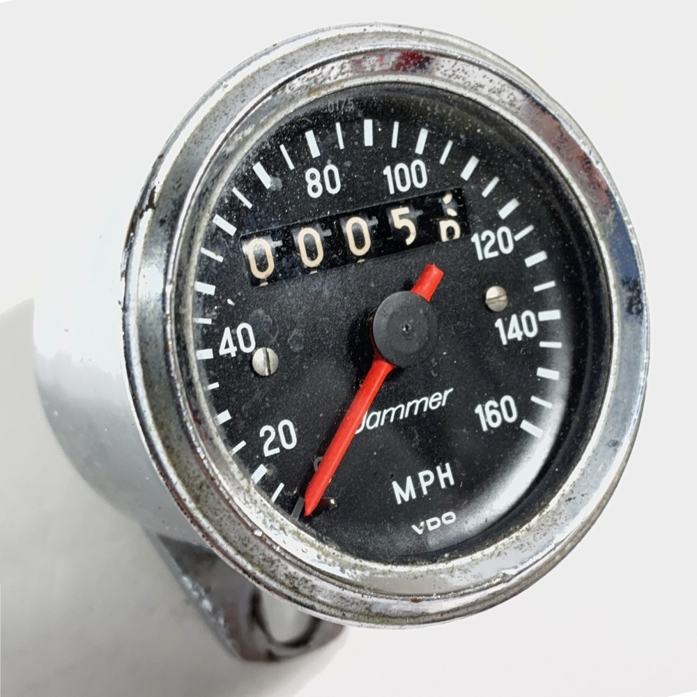 1970年代のドイツ•VDO製のスピードメーター(マイル)です。今回のものは【ジャマー別注】(コラボ?)のまさにチョッパー乗り用のメーターです。