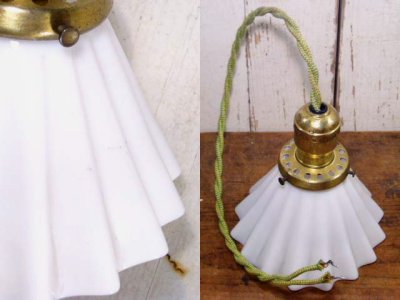 小振りなミルクグラスシェードのペンダントライトです。ペティコート形状の深めのタイプになります。スポットの様な形で使用すると雰囲気はよろしいかと思います。