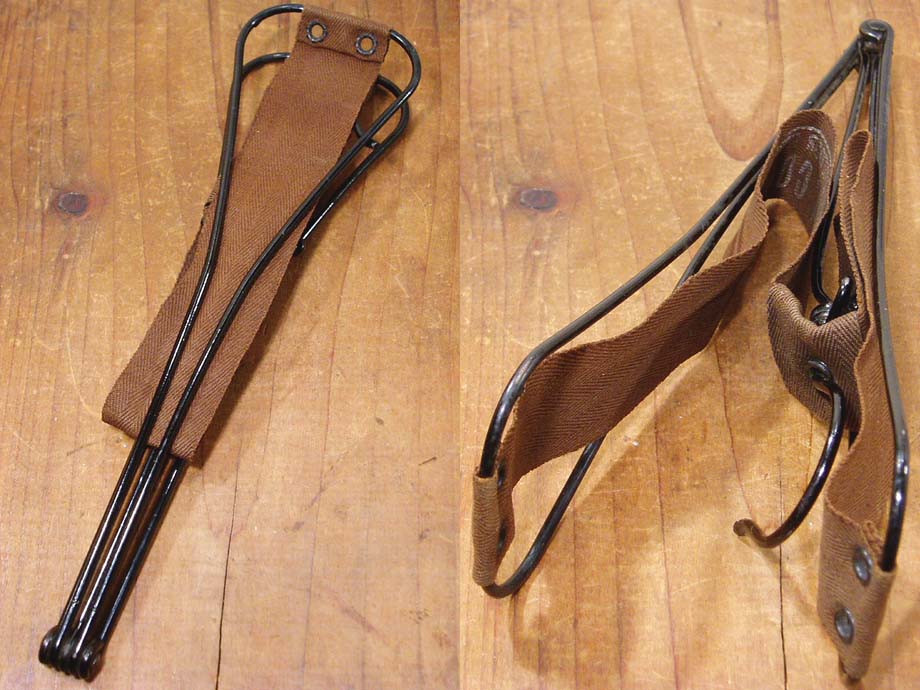 1930〜40年代の茶色のヘリンボーン布地&スチールワイヤー(黒塗装)の旅行用折り畳みハンガーです。